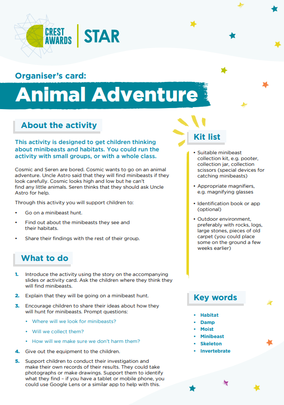 This challenge is designed to get children thinking about minibeasts and habitats. They will explore an outdoor area and go on a minibeast hunt! This editable version of the Organiser and Activity Card can be amended, allowing you to adapt the resources for the needs of your learners.