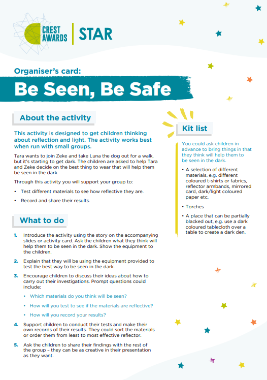 Be Seen Be Safe is designed to get children thinking about reflection and light. Can they help Tara and Zeke decide on the best thing to wear that will help them be seen in the dark? This editable version of the Organiser and Activity Card can be amended, allowing you to adapt the resources for the needs of your learners.