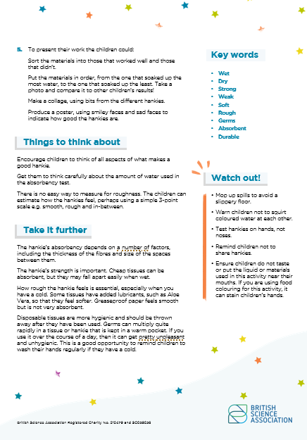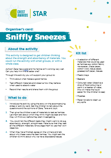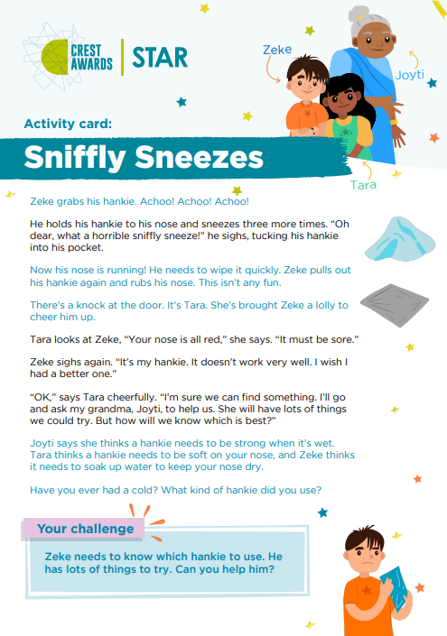 Sniffly Sneezes is designed to get children thinking about the strength and absorbency of materials. Can they help Zeke find a better hankie to blow his sore nose? This editable version of the Organiser and Activity Card can be amended, allowing you to adapt the resources for the needs of your learners.
