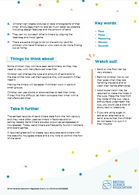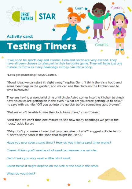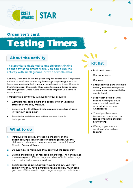 Testing Timers is designed to get children thinking about how sand timers work. Can they create their own sand timer that measures exactly one minute? This editable version of the Organiser and Activity Card can be amended, allowing you to adapt the resources for the needs of your learners.