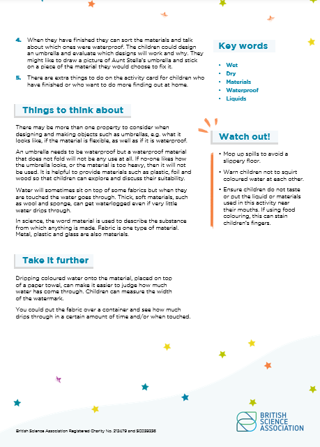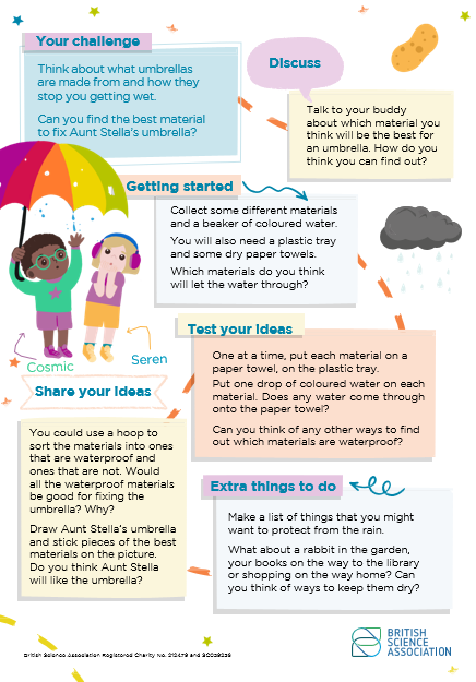 This activity is designed to get children thinking about materials and their water resistance. Can they help Cosmic and Gem find something suitable to fix Aunt Stella's umbrella? This editable version of the Organiser and Activity Card can be amended, allowing you to adapt the resources for the needs of your learners.